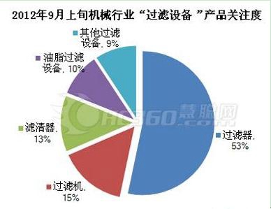 從2012年9月上旬,我國“過濾設備”的交易指數(shù)可以看出,過濾器以53%的消費指數(shù)占據(jù)過濾設備市場的半壁江山。而過濾機市場份額僅有15%的占有率,可見,過濾器的