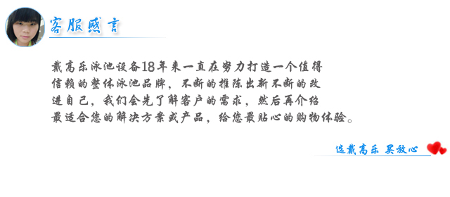 戴高樂泳池設(shè)備,18年專注整體泳池系統(tǒng)解決方案,打造整體泳池第一品牌,為您提供一站式泳池設(shè)計、過濾、消毒、吸污系統(tǒng)解決方案,服務(wù)全球超過150000個泳池工程!全國免費服務(wù)熱線:400-840-1668,戴高樂泳池設(shè)備——您全程貼心的采購顧問。