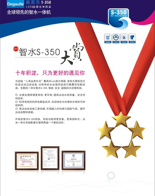 水是孕育一切生命的源泉,逐水而居,親水、樂水,是人類始終不渝的追求。古有“智者樂山,仁者樂水”的生活理想,今有“戴高樂S-350智水一體化系統(tǒng)”的夢想達成。戴高樂S-350智水一體化系統(tǒng),不僅滿足泳池的傳統(tǒng)需求,新增的鹽水理療功效,更是對現(xiàn)代化健康生活的完美詮釋。有泳池的地方就有無限生活意境,有戴高樂S-350智水一體化系統(tǒng)的地方就有無限的智水理念!