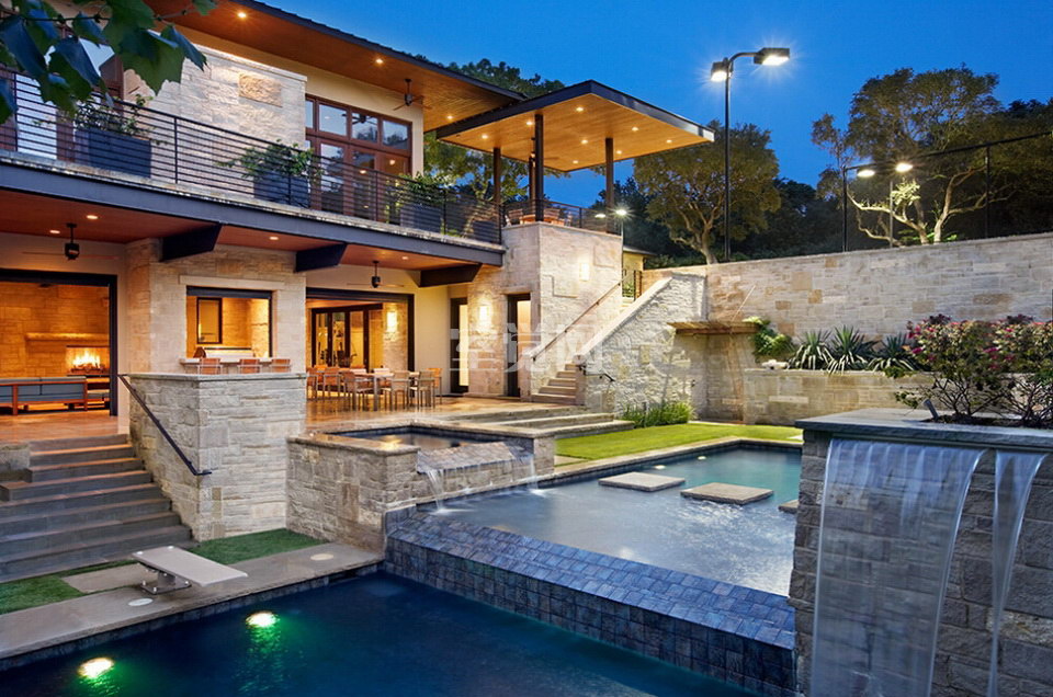 初看上去,水景園泳池與自然主義風(fēng)格的泳池非常類(lèi)似,但實(shí)際上它們差別很大。水景園泳池有更為豐富的內(nèi)容。水景園泳池好像有中國(guó)園林的精髓,設(shè)計(jì)精心、富有變化,往往有水滑梯、噴泉、瀑布、人工洞穴甚至沙灘造景。水景園泳池使得整個(gè)庭院更像美麗的自然主義園林,因此它比僅是自然主義的泳池造價(jià)要高得多,維護(hù)費(fèi)用也更高。不言而喻,擁有水景園泳池的別墅也擁有令人咋舌的價(jià)格。如果泳池和別墅搭配適宜,很多水景園泳池的夜景甚至比白天的景觀更為美麗。