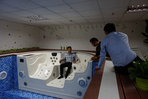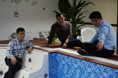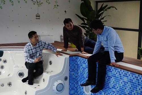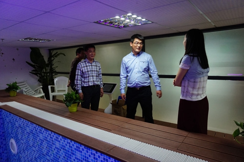 薛正浩老師在我們曹總的帶領下參觀我的展廳及我們研發(fā)設計的新產品——戴高樂可拆式活動圍板泳池。