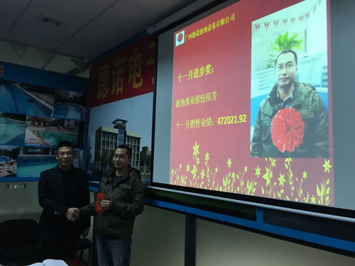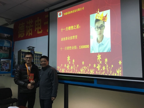 越努力,就會越幸運,這句話確實是真理!恭喜泳池事業(yè)部曹斐榮獲11月銷售之星,這次他第3次獲得月度銷售之星,11月簽訂了一個百萬大單。同時,也要恭喜泳池事業(yè)部另一位同事伍偉芳榮獲11月銷售進步獎,在11月份,伍偉芳連簽3個訂單,這是他個人努力的結果,是很大的一個突破。